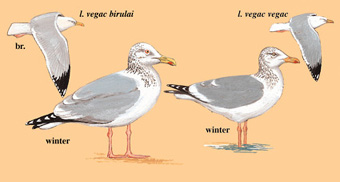其他:分类长期归入“银鸥复合体”,现基于遗传、形态、羽色及鸣声差异被独立为种。曾与美洲银鸥、银鸥、蒙古银鸥等视为同一物种。已记录与灰背鸥、灰翅鸥、冰岛鸥杂交,亦与小黑背鸥亚种heuglini与barabensis杂交形成“taimyrensis”型。