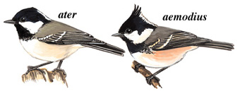 区别辨识:与欧亚大山雀及褐冠山雀区别在于胸中部无黑色纵纹,与褐冠山雀一样具有两条白色翼斑,而欧亚大山雀仅有一条。种内不同亚种间存在颜色深浅和色调的差异。