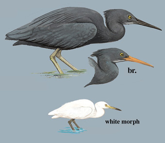 外形特征:岩鹭体型中等,长度约57至66厘米,翼展90至110厘米,平均重量约为400克。呈现明显的非性别二态性,存在纯白色('光'形态)和炭灰色('暗'形态)两种形态。幼鸟的羽毛颜色较暗淡,带棕色。不论形态,岩鹭都拥有黄绿色的腿脚,褐色喙,金黄色的眼睛,面部周围区域呈绿黄色。