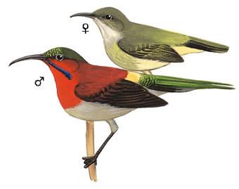 区别辨识:与猩红太阳鸟相比,主要区别在于较小的喙和更淡的整体外观。雄鸟具有独特的蓝绿色冠羽和胡须状条纹,雌鸟背部为橄榄绿色。