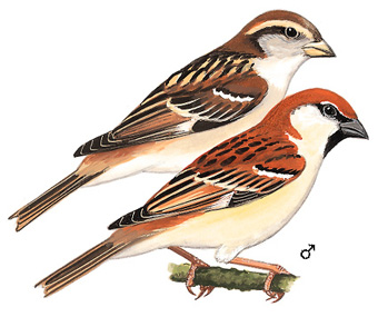 外形特征:雄鸟顶冠及背部呈鲜艳的栗色,颊部白色,喉部具狭窄的黑色斑块,腹部灰白色。雌鸟整体褐色,背部有黄褐色及黑色宽条纹,下体浅褐色,翼斑白色,眉纹宽且黄褐色。幼鸟类似雌鸟,但色泽更淡。成鸟在非繁殖季会呈现较淡的羽色。