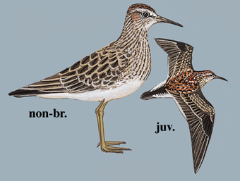 区别辨识:与尖尾滨鹬相比,斑胸滨鹬体型更大,颈部更长,胸部条纹更密集,腹部与胸部界限分明。雄鸟的喉囊在繁殖季节膨胀,是辨识的一大特征。