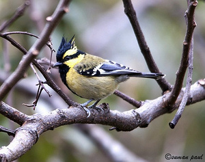 外形特征:眼纹黄山雀体长约13-14厘米,体重约12.9-19.7克。它是一种中等体型的山雀,头顶有羽冠,脸部呈黑黄相间,黄色的颈背向上延伸至最长的羽冠尖端;上体为橄榄绿至黄绿色,肩羽具黑色中心,尾羽基部白色,边缘灰色;翼羽黑色,中央和大型覆羽末端黄色;下体黑色,胸部中心和腹部中间为黑色,两侧柠檬黄色,两胁橄榄色或带有橄榄色晕染,下尾覆羽暗灰色,腋下和下翼覆羽白色。幼鸟颜色较暗淡,冠羽更短,上体颜色更灰,尾羽白色尖端模糊。