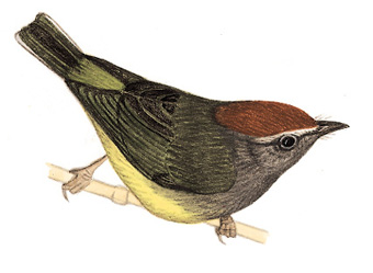 区别辨识:与金头拟缝叶莺的区别在于较短的喙、不渐变的尾羽、更广泛的栗色头部、较短的眉纹、灰色的喉和胸部,以及下方较暗淡的黄色。