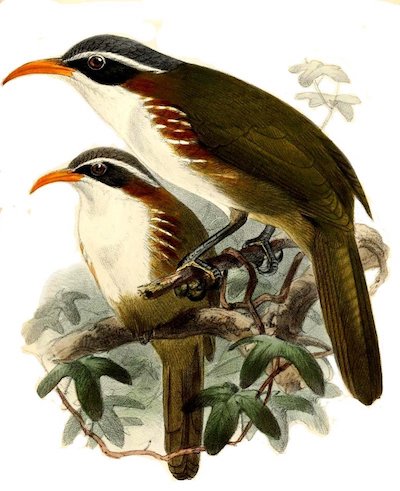 外形特征:灰头钩嘴鹛体型中等,长约19-23厘米,体重约40克。头部上方呈橄榄褐色,下方白色,具有一条醒目的长白色眉纹,黄色喙和眼睛。冠部灰色,颈部向下变为橙褐色,侧面至胸部及两侧为栗色,逐渐淡至下腹部的淡黄灰色。幼鸟比成鸟更暗淡,背部稍带棕色,前额红棕色,胸部和两胁锈色。