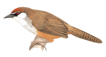 外形特征:红顶鹛是一种特色鲜明的棕色鹎鸟,拥有小而黑的面罩,白色的喉部,以及锈橙色的顶冠。其色彩搭配与斑胸剑嘴鹎相似,但具有更长、更宽的尾巴,胸部无明显的条纹,喙短而直,不弯曲。雌雄幼鸟的羽毛颜色和成鸟相似,但较为暗淡。