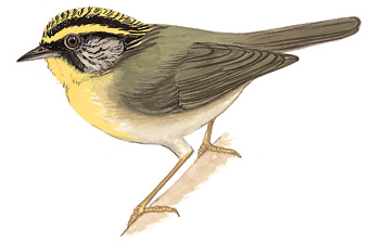 外形特征:体长约10至11厘米,体重8至13克。这是一种小巧的绿色与黄色相间的鸟,拥有鲜明的黑边黄色眉纹。头部顶部呈淡灰橄榄色,带有明显的黑色鳞状斑纹,有一条长长的黑色侧冠纹从眼上方延伸到颈背;上体为灰绿色调的橄榄绿色,翅膀和尾巴略深;宽阔的橙黄色眉纹,长而黑色的眼纹,眼下方有淡色半环;脸颊和耳羽呈浅灰色与黑色混杂;喉咙到腹部中间为黄色,胸部颜色稍暗,颈部侧面到腹侧为暗灰色橄榄色,下腹更偏橄榄色;虹膜为棕色至红色;喙为角黑色,下颌较浅;腿为黄肉色到淡橄榄棕色。两性相似。幼鸟尚未具体描述。
