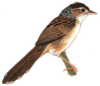 区别辨识:与南亚草鹛相比,中华草鹛的眉纹更明显,头部和上体的条纹更宽更赭色,尾羽的淡色尖端更窄,叫声更不犹豫,最终音符弯曲较少,频率更高。
