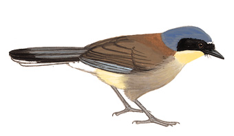 外形特征:成鸟全长约24-25厘米,头顶和颈背为暗淡的蓝灰色,额头上方有一条淡钴蓝色线条;背部、肩羽、背部和三级飞羽呈赭石栗色,大翼覆羽和初级飞羽外缘淡蓝灰色;尾羽赭石栗色,基部蓝灰色,中央尾羽具宽黑褐色尖端,外侧尾羽具宽黑褐色次端斑点和白色尖端;脸部、低额、眉区至眼后、耳羽、上须纹和下巴光泽黑色,与玉米黄色喉咙形成鲜明对比,逐渐过渡到灰色橄榄色的胸部、胸侧和胁部,中腹部呈乳黄色,大腿灰白色,尾下覆羽白色;虹膜红色;喙黑色;腿灰色。