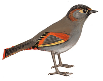 外形特征:灰胸薮鹛体长约19-20.5厘米,拥有橄榄色上体,灰色腹部,翅膀上有红色斑块,尾巴黑色带红尖,宽大的白色眼圈。雄鸟额头略显青铜橄榄色,其余冠羽呈灰色,带有深灰色条纹;上体和颈侧灰色,伴有强烈的橄榄绿色调;飞羽边缘淡黄色,翼板基部和尖端橙红色;尾羽暗橄榄灰,具黑色条纹,末端橙红。雌鸟较雄鸟灰色更浓,橙红色部分较少,尾羽和下体羽端白色微黄。幼鸟与成鸟相似,但色彩较为暗淡。