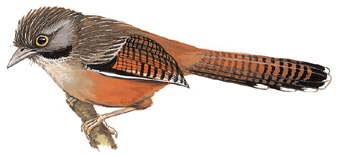区别辨识:与锈额斑翅鹛相比,纹头斑翅鹛的头部颜色更偏向棕色,暗色次级飞羽条纹较弱,叫声也更低沉。