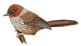 外形特征:体长约18-19厘米,体重平均32克。头部呈栗色,具银色条纹颈圈,翼尖细条纹,尾部基部红褐色,覆有密集的黑色横斑。胸部橄榄灰色,腹部红棕色,带有模糊的条纹。两性相似,幼鸟描述不明。