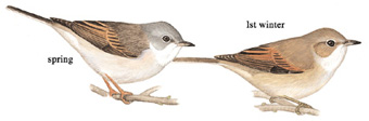 外形特征:灰白喉林莺具有明显的性别差异。雄鸟具有灰色头部和纯白色喉部,全身主色调为棕色,翅膀边缘带有醒目的锈色。雌鸟则整体更显暗淡,头部颜色偏棕色,喉部颜色较雄鸟更为暗淡,缺乏明显的灰色调。幼鸟则呈现较为均匀的浅棕色,喉部为淡白色,下体主要为淡黄色,虹膜呈深灰色橄榄色。成年鸟的虹膜为淡黄色到浅棕色,喙尖和鼻基部分为深灰色,腿部颜色为粉棕色,有时带黄色调。
