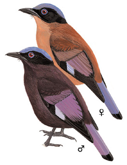 区别辨识:紫宽嘴鸫羽色独特,雄鸟紫灰、雌鸟栗褐,均具银蓝头顶与黑色面部,极易与其他鸫类区分。与同属的绿宽嘴鸫相比,羽色更偏紫,鸣声更低沉。幼鸟羽色近似雌鸟,但具明显斑点与鳞纹,可据此识别。