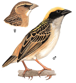 区别辨识:黄胸织雀与纹胸织雀的区别在于前者缺乏强烈的条纹外观,尤其是繁殖季节雄鸟的黄色和深色对比明显。